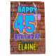 La parte delantera de este divertido diseño de bolsos de regalo con temática de cumpleaños incluye el mensaje "FELIZ CUMPLEAÑOS 45″, con un colorido, vibrante arte urbano e inspirado en el graffiti, además de un nombre editable para el destinatario. El fondo está decorado con un patrón inspirado en el aspecto de una pared de ladrillo. Una bolsa de regalo vibrante con temática de cumpleaños como esta podría ser usada cuando se da un regalo o regalo para la celebración de los cuarenta y cinco años de alguien. [~Z0000536]