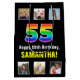 Este llamativo y audaz diseño de bolsos de regalo con temática de cumpleaños presenta un gran número de "55" con un patrón de gradiente inspirado en el espectro de colores del arcoiris, junto con el mensaje "Feliz cumpleaños número 55", y un nombre de destinatario personalizado. Las fotos de arriba y abajo del mensaje pueden ser personalizadas, tal vez con fotos del destinatario, la familia y amigos del destinatario, y/o el(los) remitente(s) del regalo. Una tibia mochila de regalo como esta puede ser usada cuando se da un regalo o regalo en honor de los cincuenta y cinco años de alguien. (Fotografía © Storytree Studios, Stanford, CA.) [~Z0000669]