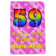 Este diseño de bolsos de regalo con temática de cumpleaños animado, divertido y amoroso presenta un gran número "59" con un patrón inspirado en el gradiente del espectro del arco iris, junto con el mensaje "Feliz cumpleaños número 59", y un nombre de destinatario personalizado. También tiene un fondo alegre con formas cardíacas y rayas de color rosa. Una feliz bolsa de regalo como esta podría ser usada cuando se le dan regalos a alguien en celebración de sus cincuenta y nueve años. [~Z0000511]