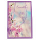 Un diseño floral contemporáneo moderno hermoso del cumpleaños conveniente para cualquier hembra de cualquier edad. Una imagen impresa del atontamiento del flor rosado y blanco bonito en un pastel imponente coloreó el fondo con un marco precioso de la frontera de la lila, con sus detalles del acontecimiento. Todo el texto es completamente adaptable cumplir sus requisitos, si usted necesita alguna ayuda en modificar su producto para requisitos particulares me entra en contacto con por favor a través de mi tienda y me plazco muy ayudarle.