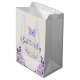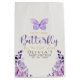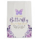 Diseño lindo de Bolsas de papel para fiesta de Baby Shower con una Hermosa Tematica de Mariposas y flores en acuarela en tonos Rosas y Purpuras. con linda tipografia dorada con la frase " A LITTLE BUTTERFLY IS ON THE WAY" un fondo amarillo claro es ideal para recibir a esa dulce niña que viene en camino. Se puede personalizar con el nombre de tu bebe.