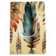 Azteca boho nativa acuarela de Estados Unidos diseño tribal de plumas azul turquesa, girasoles rojos abstractos y formas geométricas sobre un fondo de arena desértica.