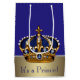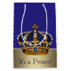 Bolsa de regalo de la ducha de bebé príncipe con una hermosa corona azul real y dorada sobre un rico fondo azul real y dorado. Puede cambiar o quitar el texto.