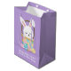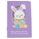 Personalizar este lindo bolso de regalo del conejo de Pascua con tu propio texto personalizado con el nombre de tus hijos en escritura blanca. Este adorable conejo de conejo se sienta en una canasta de Pascua de bonito en una bolsa de regalo morado.