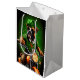 Un amigo peludo detrás de las manillares de una brillante bicicleta verde, usando un traje verde del Día del San Patricio que hace que las cabezas se vuelvan. El perro está vestido con un conjunto festivo, con una corbata verde de arco y un sombrero superior a juego que se sienta cómodos sobre su cabeza. El conjunto presenta un diseño intrincado de rocas de champú y leprechauns, lo que deja claro que este perro está listo para celebrar el Día de San Patricio con estilo.