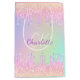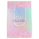 Un arcoíris, fondo holográfico de unicornio en rosa, púrpura, dorado rosa y verde menta con gotas de brillo falso y pintura goteante. Personaliza con un nombre y las iniciales del monograma. El nombre está escrito con una fuente de letra de moda. Puede ser utilizado para envolver regalos y como favor de fiesta para cumpleaños, despedidas de soltera y baby showers