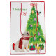A cada lado de esta bolsa de regalo de Navidad, un Bulldog blanco usa una bufanda roja mientras ve un pájaro bullfinch aterrizar en el árbol de Navidad. Alrededor del perro se reparten paquetes de regalo envueltos de forma brillante. El texto rojo y verde dice "Navidades DISFRUTAN".