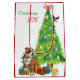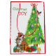 A cada lado de esta bolsa de regalo de Holiday, un lindo Bulldog marrón y blanco está mirando hacia un aterrizaje de toros en el árbol de vacaciones. El perro está envuelto en una cuerda de luces de árbol, y los paquetes de regalo envueltos brillantemente se dispersan por todas partes. El texto rojo y verde dice "Navidades DISFRUTAN".