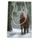 Bolsa de regalo con una fotografía de un caballo marrón con una larga melena blanca. En un bosque con copos de nieve cayendo por todos lados.