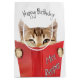 Tabby cat reading red mice recipe book on white background for birthday.