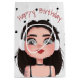 Chica personalizado con auriculares, tatuajes y ojos grandes en un fondo de puntos polka con texto de cumpleaños feliz. El texto es modificable o se puede eliminar.