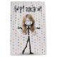 Chica de la figura del palo lindo con pelo rubio y anteojos en un fondo de puntos polka pastel para el cumpleaños. Se puede cambiar el fondo. El texto es editable.
