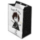 Chica de palos con pelo, gafas, polka dot dress, sneakers, y daisy bouquet sobre un patrón de polka blanco y negro. El texto se puede editar o eliminar.