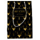 Esta bolsa de regalo presenta un patrón de moda de siluetas de cabeza de ciervo con cortantes curvados, flechas estilizadas y pequeños copos de nieve con un efecto texturizado en tonos dorados sobre un fondo negro. Se ha proporcionado texto opcional de 'Happy Holidays' y una etiqueta para añadir tu nombre y/o otro texto. Busque ID861 a ID864 para ver opciones de color adicionales y otros productos en este moderno conjunto de diseño de Navidades.