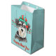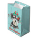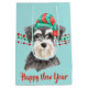 Un lindo perro Schnauzer lleva un gorra rojo y verde de Papá Noel delante de cuerdas de cuentas rojas y verdes de Navidades a ambos lados de esta bolsa de regalo. En la parte inferior hay campos de texto en rojo coincidente para tu propio texto. Actualmente un lado dice "Feliz Navidad" y el otro lado dice "Feliz Año Nuevo", pero puedes cambiarlos si quieres. Las imágenes y el texto se colocan sobre un fondo verde de menta más claro. Asegúrate de ver los productos a juego en nuestra tienda.