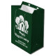 Esta bolsa de regalo verde de la compañía de bienes raíces forestales está perfectamente personalizada para un agente inmobiliario que se especializa en casas cerca de la naturaleza o bosques. La silueta blanca de los árboles detrás de una cabaña de troncos y personalizada con el nombre de su agente y negocio de bienes raíces para un regalo de inauguración.