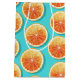 Un patrón de rodajas naranjas frescas y jugosas en tonos profundos de naranja de mandarina y naranja rojo, con una textura acuarela para darle ese aspecto recién cortado. Están colocadas sobre un fondo azul brillante para dar un aire luminoso y veraniego.