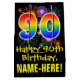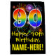 Este emocionante, colorido y divertido diseño de bolsos de regalo de cumpleaños incluye un gran número "90" con un patrón de estilo gradiente de espectro de arco iris, junto con el mensaje "Feliz cumpleaños 90", y un nombre de destinatario personalizado. También tiene un colorido patrón de fondo inspirado en la apariencia de fuegos artificiales de celebración reventando. Una bolsa de regalo como esta podría ser una manera divertida de envolver un regalo de cumpleaños o un regalo para alguien que esté celebrando su cumpleaños número 90. [~Z0000509]