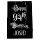 Este elegante y ornamentado diseño de bolsos de regalo de cumpleaños presenta el mensaje "Feliz cumpleaños 94", en texto estilo guión sofisticado, en un fondo de color negro. También tiene un nombre de destinatario personalizado. Una bolsa de regalo formal con tema de cumpleaños como esta podría ser una manera respetable de envolver un regalo o regalo para alguien que esté celebrando su cumpleaños 94. [~Z0000557]