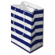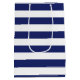 Este bolso temático náutico del regalo tiene un ancla de los azules marinos con una frontera circular de la cuerda y un fondo rayado del azul marino y blanco. El texto de los azules marinos sobre el ancla lee "feliz cumpleaños". El texto abajo es un nombre para que usted personalice.