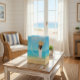 The artwork captures a peaceful seaside moment — a woman in a flowing white dress and sunhat standing by the ocean — creating an instantly relaxing vacation vibe. Soft blue skies, turquoise water, and sandy shores make this bag perfect for beach properties and coastal stays.