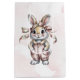 A cute cartoon illustration of a bunny wearing a pink and mint green floral headscarf with a bow. The bunny has long, upright ears, large expressive black eyes, and a happy smiling expression. It is wearing a pink and mint green long-sleeved outfit with a lace-trimmed collar and decorative buttons down the front. The bunny's outfit includes a pair of pink overalls with front pockets and ruffled details. The bunny is standing upright in a friendly pose with its hands at its sides. The illustration has clean lines and a soft, watercolor-style finish. The bunny's fur is rendered in light beige and white tones, with subtle shading to create depth and dimension. The overall composition is centered on a white background, creating a sweet, childlike illustration style.