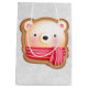 Bolsa de regalo con una cara de oso adorable y adorable puesta en una base de galletas. Llevando una bufanda de rayas rojas y blancas. El fondo es un patrón que tiene el aspecto de caída de la nieve, en plata y blanco.