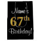 Este elegante, lujoso y elegante diseño de bolsos de regalo de cumpleaños incluye el número ordinal "67th" con un aspecto falso/imitación de oro, además de un mensaje de bienvenida de cumpleaños y un nombre de destinatario de personalizable con un tipo de letra estilo script. El fondo es negro de color. Una bolsa de regalo como esta puede ser usada cuando se da un regalo o regalo en honor a los sesenta y siete años de alguien. [~Z0000513]