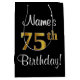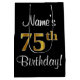 Este sofisticado, elegante y lujoso diseño de bolsos de regalo con temática de cumpleaños presenta el número ordinal "75", con una gran apariencia inspirada en el oro de imitación/imitación, además de un mensaje de bienvenida de cumpleaños y un nombre de destinatario personalizado con un tipo de letra estilo script. También tiene un fondo de color negro. Una bolsa de regalo como esta puede ser usada cuando se da un regalo o regalo en honor de los setenta y cinco años de alguien. [~Z0000513]