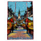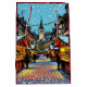 Una bolsa de regalo de Navidad con una representación de dibujos animados del mercado de Navidad de Estrasburgo, Francia, que muestra puestos de compras y personas caminando alrededor en un día invernal nevado.