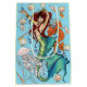 Sirena de cabello rojo con joyas de oro. La sirena tiene una cola verde azulada, azul y verde. Alrededor de la sirena hay un caballito de mar, peces gelatina, conchas marinas y burbujas de agua, todo en el fondo de azul