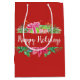 Este diseño tiene un fondo rojo sólido, que se puede personalizar. En el centro, hay una corona de helechos, poinsettias y cajas de regalo rosas y verdes. El texto del guión dice "Felices Fiestas" y puede ser personalizado con su propio mensaje. Las bolsas de regalo están disponibles en grandes, medianas y pequeñas.
