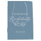 Una bolsa de regalo para una fiesta de despedida de soltera chic en azul polvoriento para un fin de semana costero de verano junto al mar. Personalice estas bolsas de regalo de color azul grisáceo claro con tipografía minimalista elegante para que coincida con su esquema de color nupcial tranquilo.