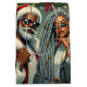 Santa y un acompañante están listos para celebrar, ambos con elegantes atuendos temáticos de Navidades. Se paran en un fondo de luces y decoraciones de vacaciones, listos para una reunión festiva.
