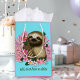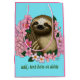 Un lindo perezoso sentado entre flores rosadas sobre un fondo azul