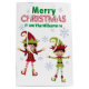 Esta linda y divertida bolsa de regalos para personalizados de festividades incluye un tema de Navidades festivos. Una imagen de dos elfos - un hermano y una hermana - son retratados bailando en la parte inferior. Usted puede reemplazar las caras de los elfos con las fotos del personalizado de su hijo. Un saludo navideño de Feliz se imprime en la parte superior con la palabra "Merry" impresa en un diseño de Relieve metalizado verde, y la palabra "Navidades" impresa en un globo de Relieve metalizado a rayas de caña de dulces. A continuación se imprime un nombre de familia de ejemplo en un tipo de letra verde llamativo. Los copos de nieve de estilo purpurina azul acentúan el fondo.