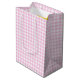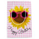 Girasol amarillo con gafas de sol de puntos de polka rosa sobre fondo de gingham rosa y blanco.