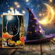 Un gato negro se sienta en una puerta con calabazas, linterna, palo de labranza, hojas de otoño y una luna llena de cosecha detrás.
