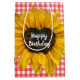 Girasol amarillo con corazón en medio sobre fondo de gingham rojo y blanco para un cumpleaños u otro evento. El texto se puede editar o eliminar.