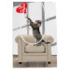 Gato de tabby parado en una silla de cuero beige jugando con un globo de corazón rojo para el cumpleaños.