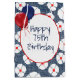 Flores blancas con centros rojos en tela de jean azul y globos por 75 años. La edad se puede cambiar.
