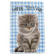 Un gatito gris sobre fondo de gingham blanco y azul descolorido para el cumpleaños. El texto se puede editar.