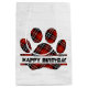 Papel de mascota trenzado rojo y negro con texto de cumpleaños feliz sobre madera pintada de blanco descolorido. El texto es editable.