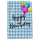 Patrón de comprobación de gingham azul y blanco Aqua con texto de cumpleaños feliz y ramo de globo de colores. El texto se puede cambiar o eliminar. El tamaño del patrón de gingham se puede aumentar o disminuir.