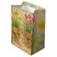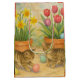 This gift bag showcases two tabby kittens, Easter eggs, and clay pots adorned with tulip and daffodil flowers. The illustrated watercolor design is presented on a parchment background. Ideal for holiday gifting, this charming bag is sure to delight any cat lover. For coordinating tissue paper, please visit my tissue paper collection.
