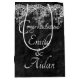 El encaje blanco bordea la textura de cuero negro con nombres de novias y novios. Los nombres son modificables o se pueden eliminar.