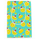 Una bolsa de regalo mediana con un patrón de limones sonrientes en sombreros Santa sobre un fondo verde azulado brillante.
