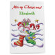 Esta bolsa de regalo de la festividad navideña presenta una imagen bonita de un conejo personalizado saliendo de un caldo de Navidades de rayas rojas y verdes. Dos medias adicionales llenas de regalos y latas de dulces completan la imagen, y todo está colocado sobre un fondo blanco y fresco. Coloque fácilmente su propio texto y nombre en los campos de personalización para personalizar este bolso. ¡Festividad, única y colorida! ¡A los niños les encantará! Ambos lados de la bolsa tienen la misma imagen.