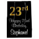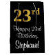 Este elegante, sofisticado y lujoso diseño de bolsos de regalo con temática de cumpleaños presenta un gran número ordinal "23" con un aspecto de imitación/faux de oro, además del mensaje de bienvenida de cumpleaños "Feliz cumpleaños número 23", y un nombre de destinatario personalizado con un tipo de letra estilo script. El fondo es negro de color. Una bolsa de regalo con temas de cumpleaños como esta puede ser una manera divertida de envolver un regalo o un regalo para celebrar el 23 cumpleaños de alguien. [~Z0000514]