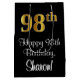 Este elegante, elegante y sofisticado diseño de bolsos de regalo con temática de cumpleaños presenta un gran número ordinal "98th" con un aspecto imitación/falso de inspiración dorada, además del mensaje de bienvenida de cumpleaños "Feliz cumpleaños 98th", y un nombre de destinatario editable con un tipo de letra estilo script. El fondo es negro de color. Una bolsa de regalo con temas de cumpleaños como esta podría ser usada cuando se da un regalo o regalo para la celebración de los noventa y ocho años de alguien. [~Z0000514]